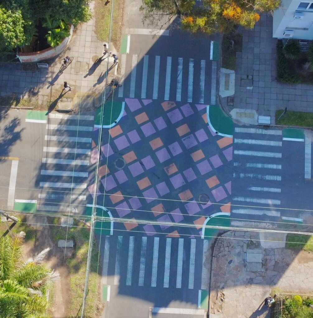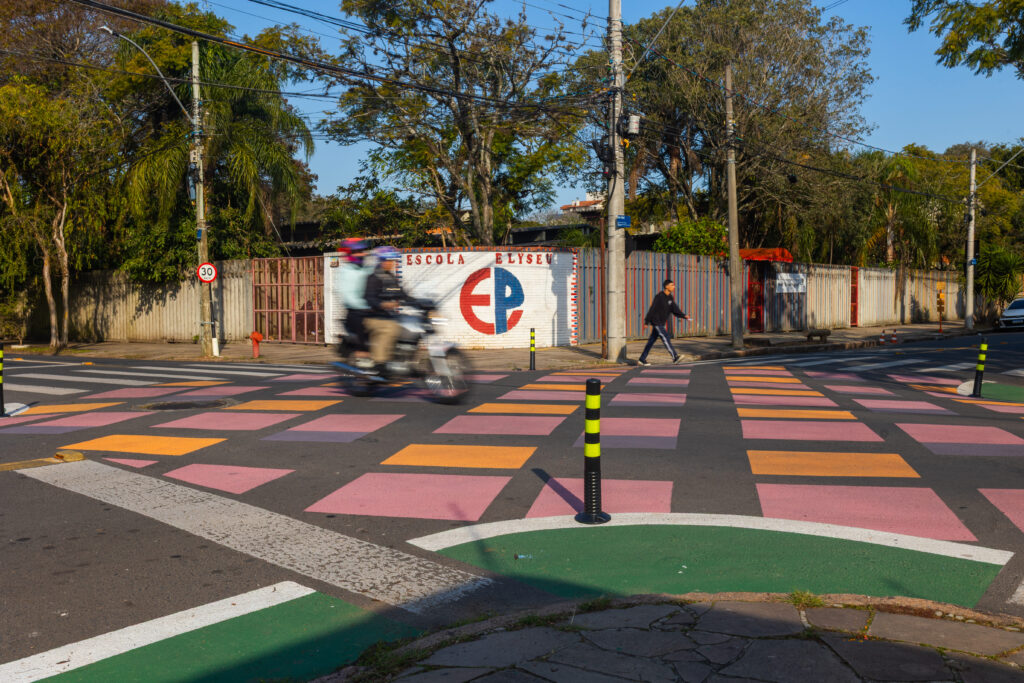 Os entornos escolares surgem como áreas críticas de proteção. Por isso, em 2025, a Fundação realizou uma intervenção de urbanismo tático no bairro Cristal, com foco em reduzir velocidades e aumentar a segurança dos jovens.