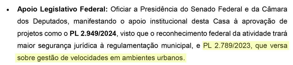 Seu texto, porém, não se limitou às regras locais. Os vereadores da capital paulista, por meio do documento, recomendaram envio de ofício em apoio ao PL das Velocidades Seguras (2789/2023) à Presidência do Senado Federal e Câmara dos Deputados.